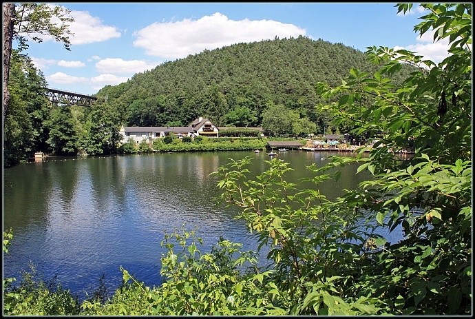 Auf der Staumauer steht das ehemalige Jagdhaus der Industriellenfamilie Gienanth.