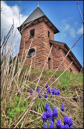 Hoch über dem Tal erhebt sich der Sandsteinbau der Friedenskapelle.