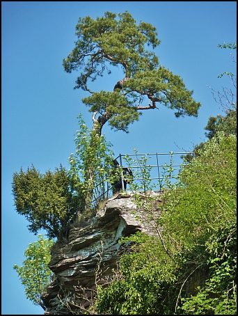 von Gebüsch umrankt, einsam über die tiefen Bergwälder schauend. (A. Becker)