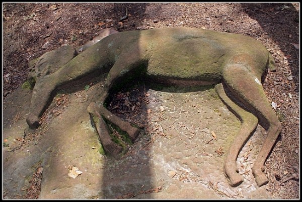 Steinerner Hirsch _______________________________________________________________________________________________________________________________________________ Oberhalb der Wolfsburg, auf dem Weg zum Weinbiet (Wegemarkierung "Roter Punkt"), findet man einen in den Fels gemeiselten toten Hirsch.